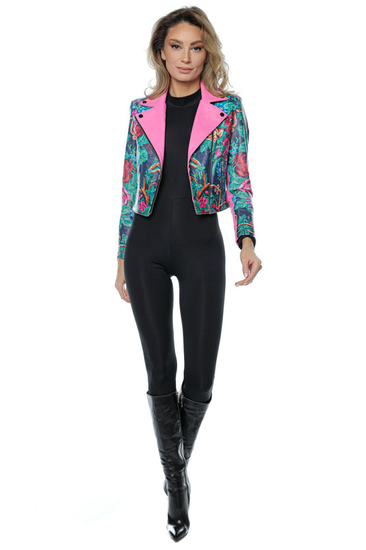 Geaca YA Frida by YOKO AIDA - Piele Naturală, Print Floral Tradițional, Roz, S