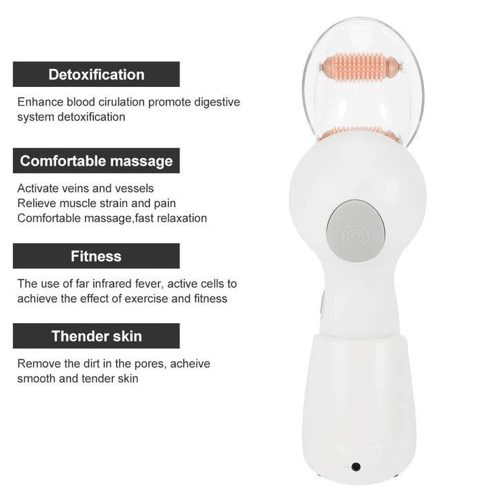 - Acțiune dublă: Aspiră aerul și folosește role pentru a targeta zonele afectate de celulită, aplatizând grăsimea denivelată de sub piele.
