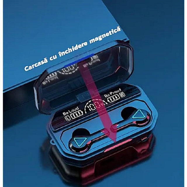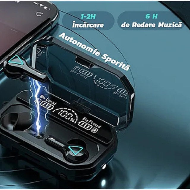 - Ecran LCD Integrat: Monitorizați în timp real starea bateriei și informațiile despre conexiunea Bluetooth. Verificați nivelul de încărcare al căștilor și al cutiei de transport cu un simplu gest.