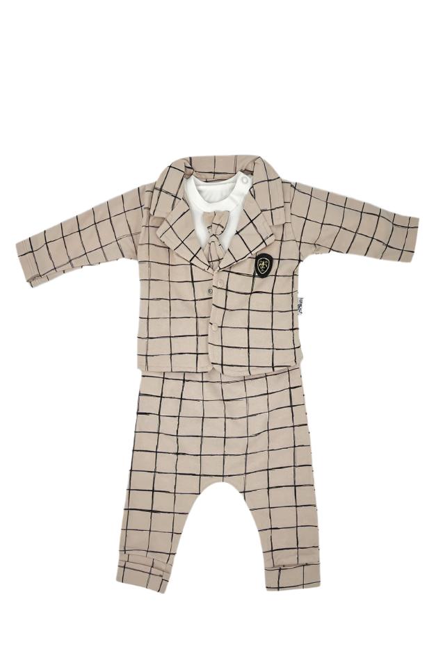 Îmbină stilul cu confortul cu acest elegant Costum Bebe din Bumbac, special conceput pentru bebeluși cu vârsta de 3-6 luni. Format din trei piese esențiale - sacou, body cu cravată și pantalonași - acest set este ideal pentru ocazii speciale sau pentru a adăuga un strop de sofisticare în garderoba micuțului tău.