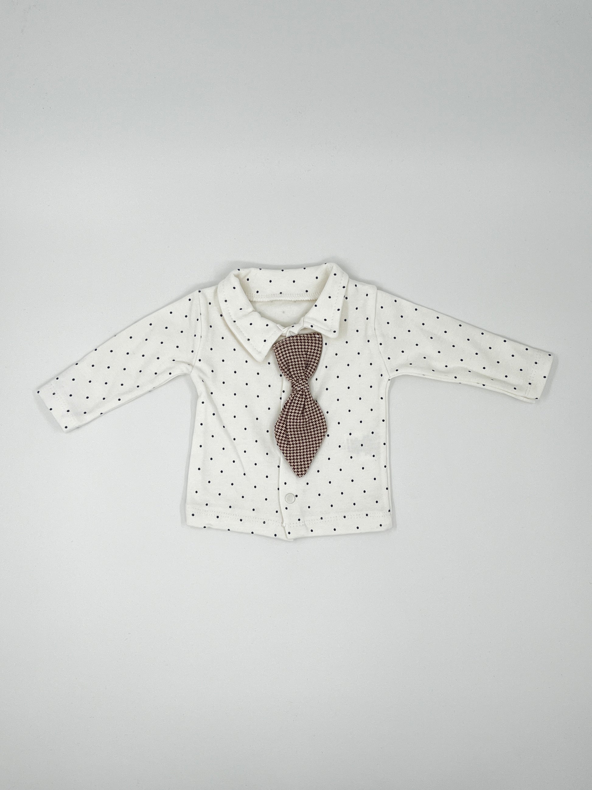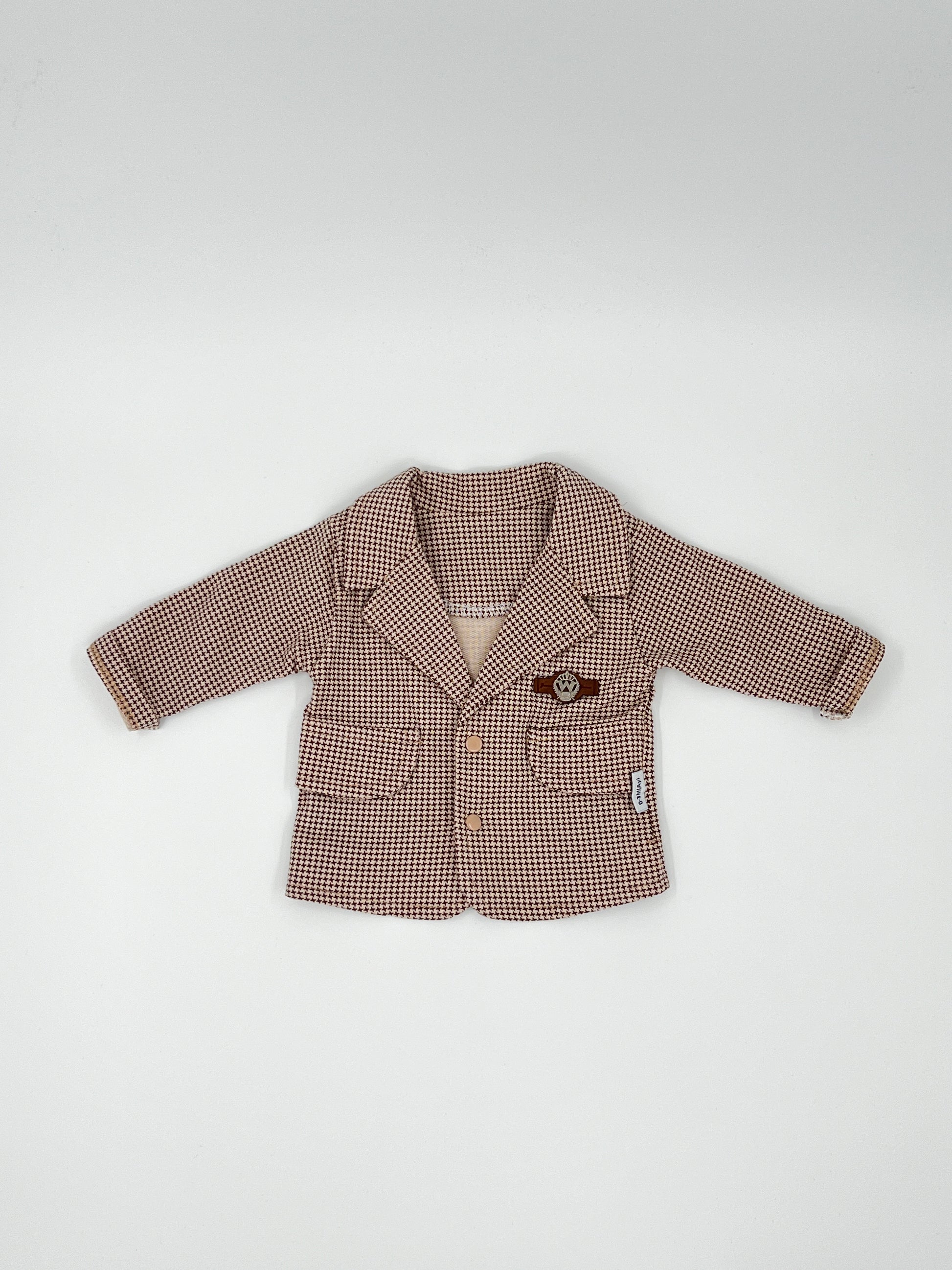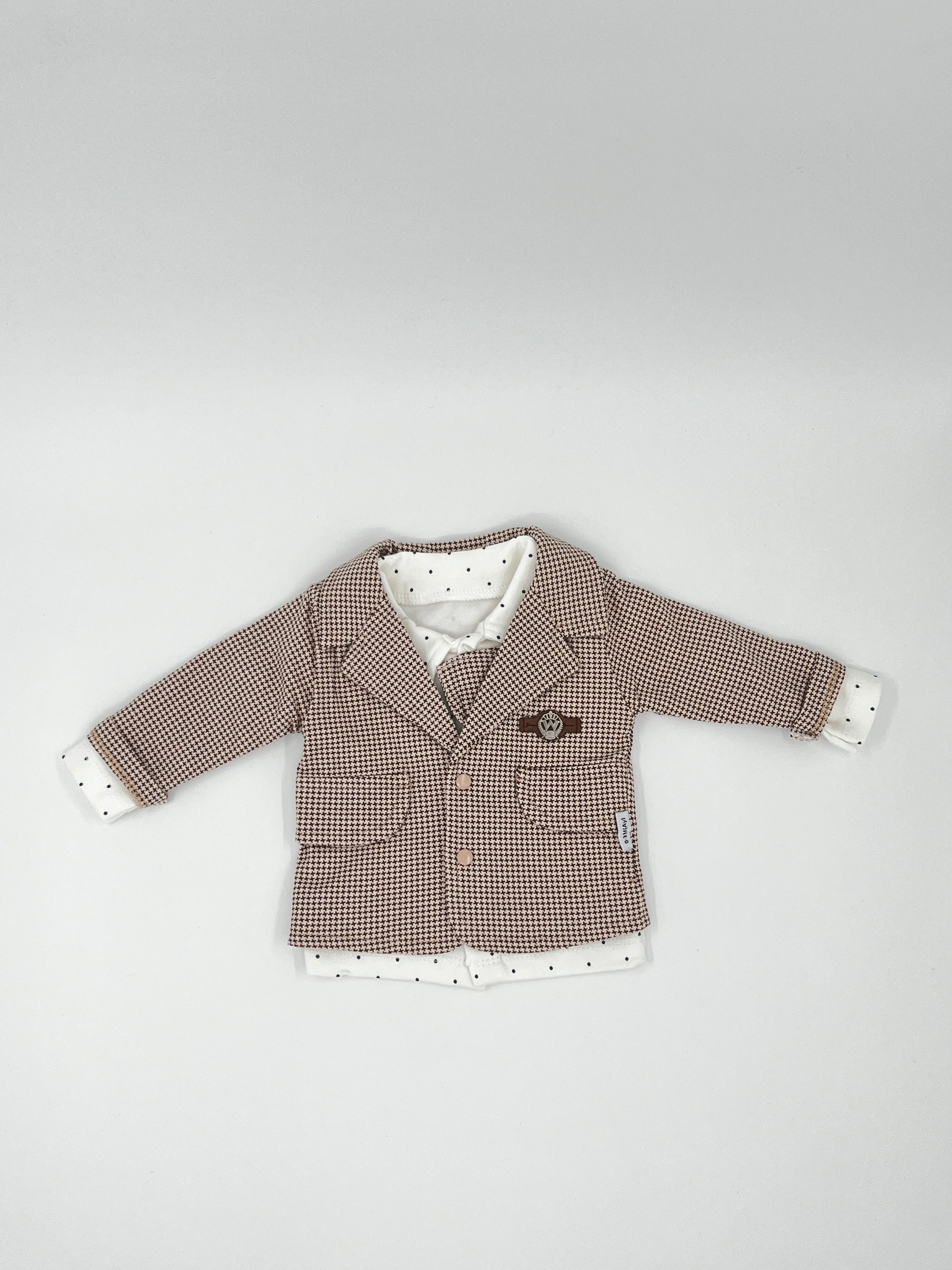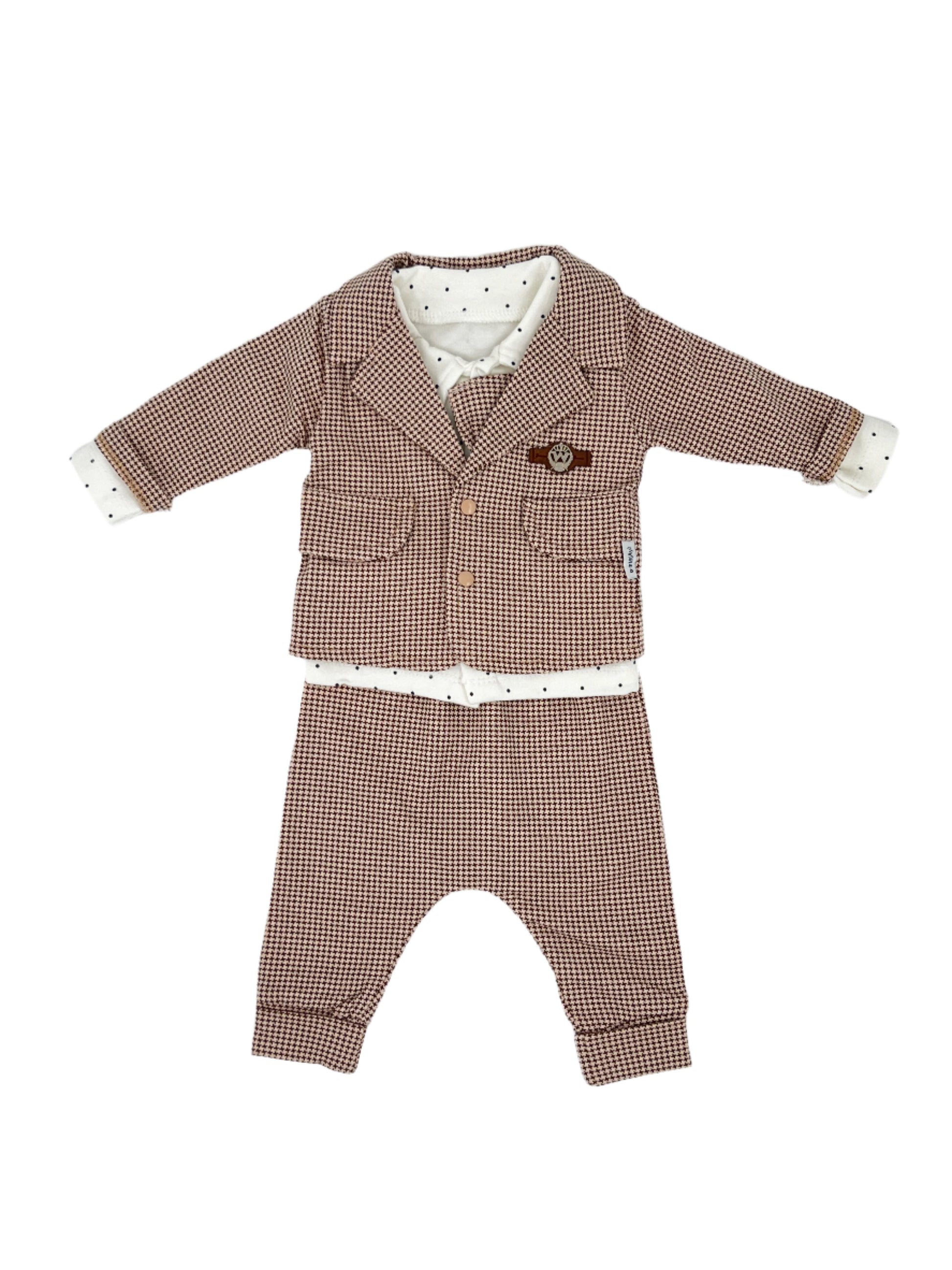 - Imprimeu și Culoare: Costumul dispune de un imprimeu vesel cu buline și steluțe, iar culoarea maro adaugă un plus de eleganță și căldură.