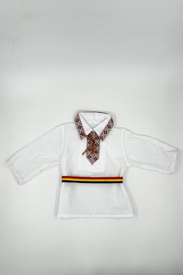 - Cămașă: Realizată din bumbac 100%, cămașa este ușor de purtat și oferă un aspect tradițional completat de motivele naționale.