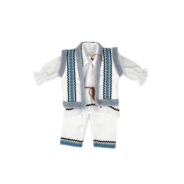 Descriere Produs: Costumul tradițional pentru bebeluși este un ansamblu elegant format din 4 piese: vestă, cămașă, pantaloni și brâu tricolor. Realizat din materiale de calitate superioară, cum ar fi bumbacul și poliesterul, acest costum este perfect pentru a sărbători ocaziile speciale din viața micuțului tău.