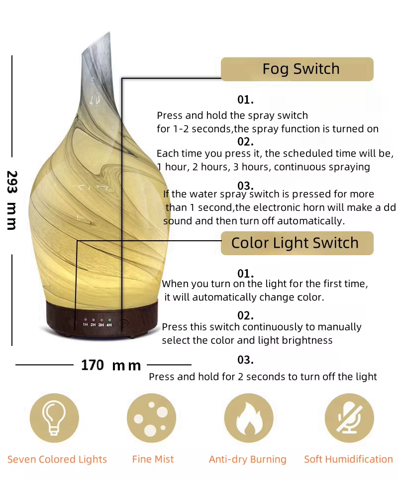 Realizat din materiale durabile precum sticlă 3D, ABS și PP, acest dispozitiv elegant oferă o atmosferă sofisticată și un aer mai sănătos în orice încăpere. Cu o capacitate de 120 ml, este capabil să funcționeze până la 4 ore, iar funcția de oprire automată te asigură că utilizarea este întotdeauna sigură.