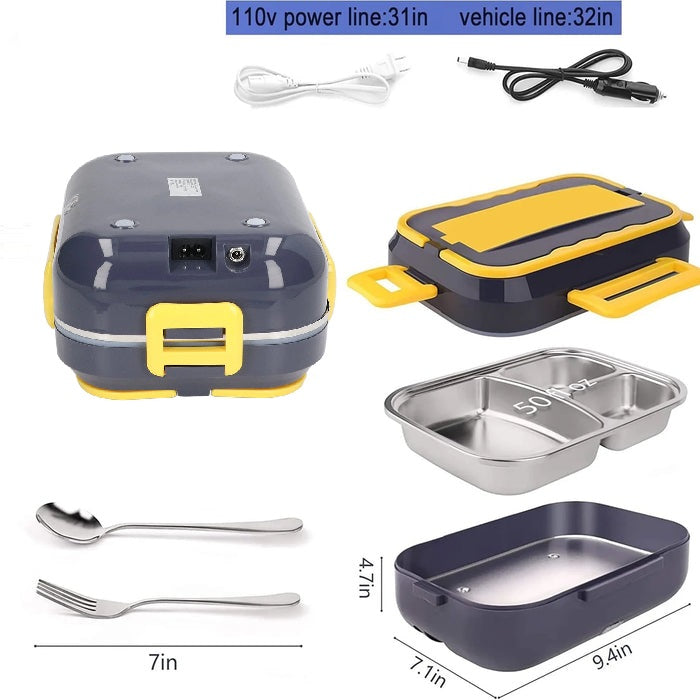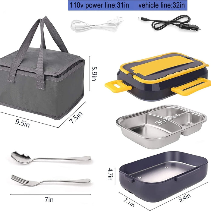 Cutia de prânz este dotată cu două prize: una de 110V pentru încălzirea mesei la birou sau la școală și un adaptor 12V-24V pentru utilizare în mașini sau camioane. Astfel, aveți întotdeauna opțiunea de a savura o masă caldă, indiferent de locul în care vă aflați.