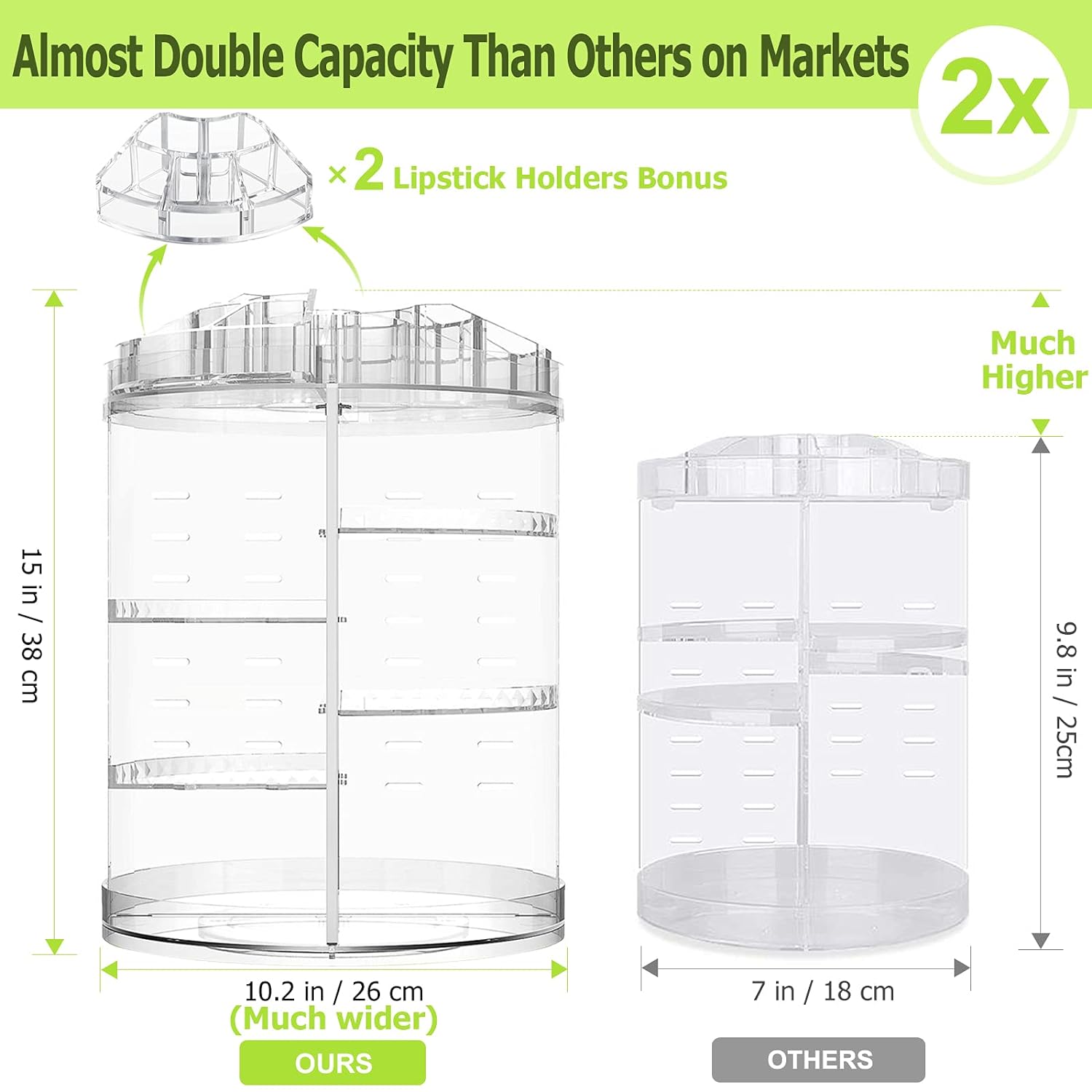 - Capacitate Extra-Large: Poate găzdui peste 60 de produse de machiaj și îngrijire, economisind 50% din spațiu. Dimensiuni generale: 10.2x10.2x15 inch.