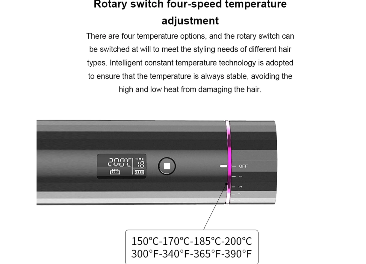 Ecranul LCD oferă o experiență intuitivă și îți permite să selectezi timpul de ondulare, între 8 și 18 secunde, în funcție de textura părului și de intensitatea dorită a buclelor. Poți astfel să ajustezi atât temperatura, cât și timpul pentru o coafură perfect adaptată nevoilor tale.