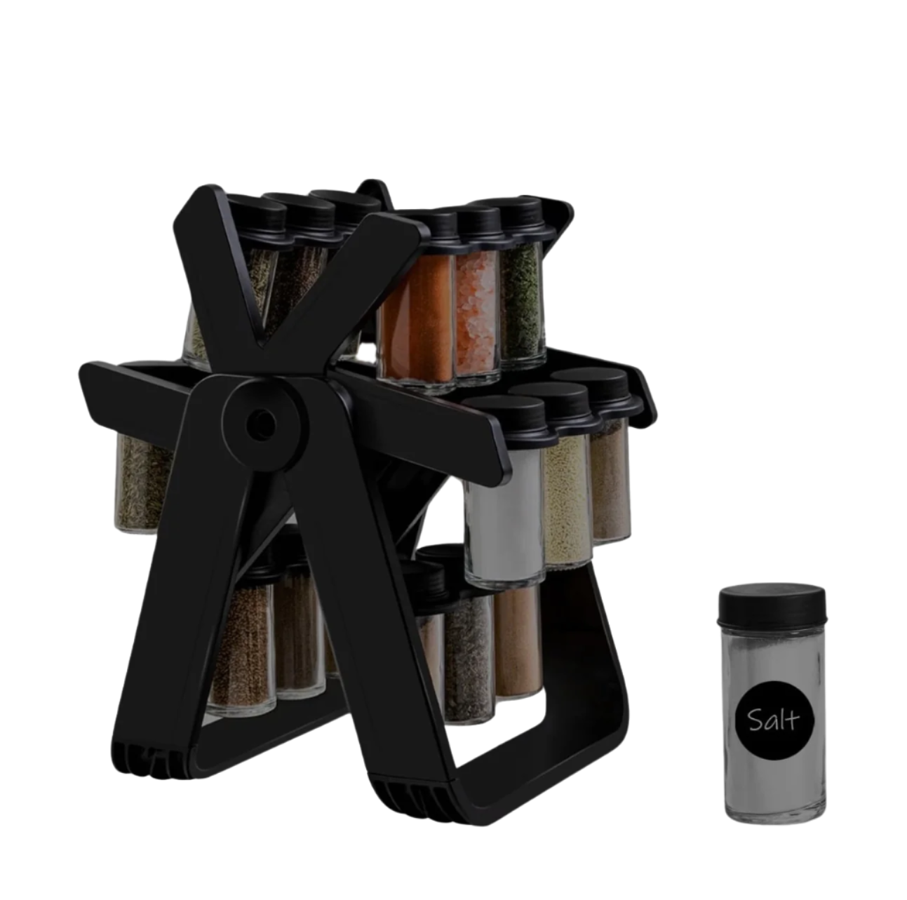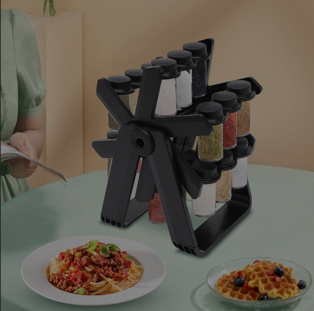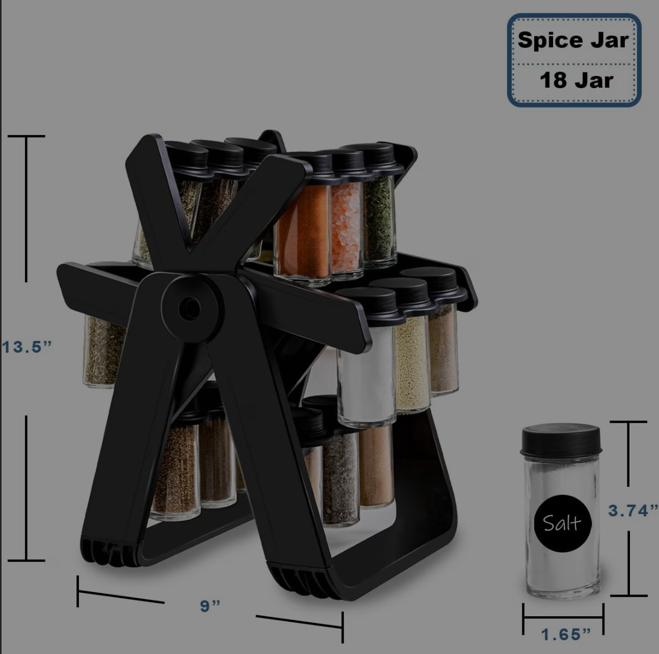 Transformă-ți bucătăria cu Organizatorul Rotativ de Condimente, care vine echipat cu 18 borcane de sticlă, ideal pentru păstrarea condimentelor tale preferate proaspete și bine organizate.