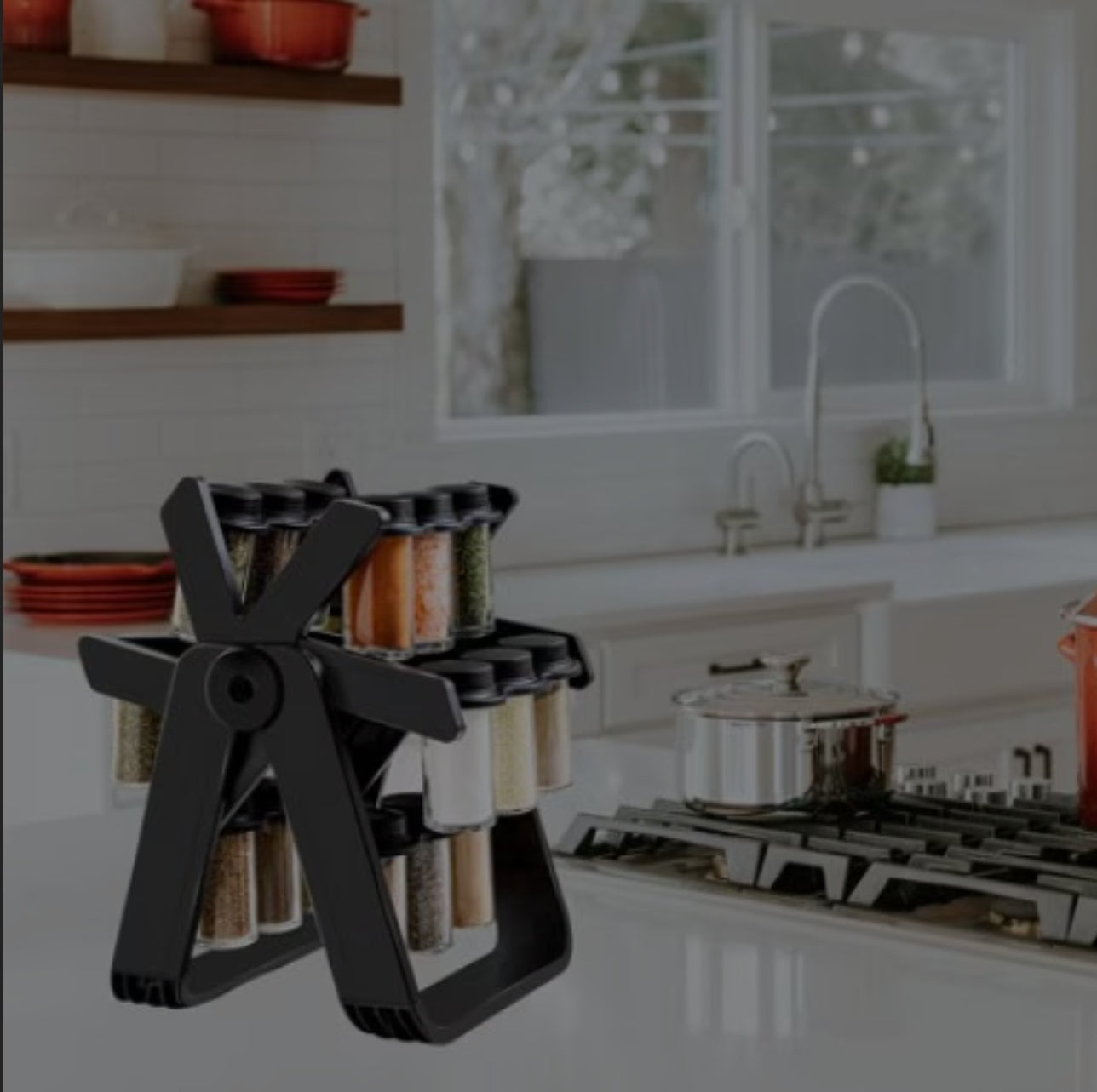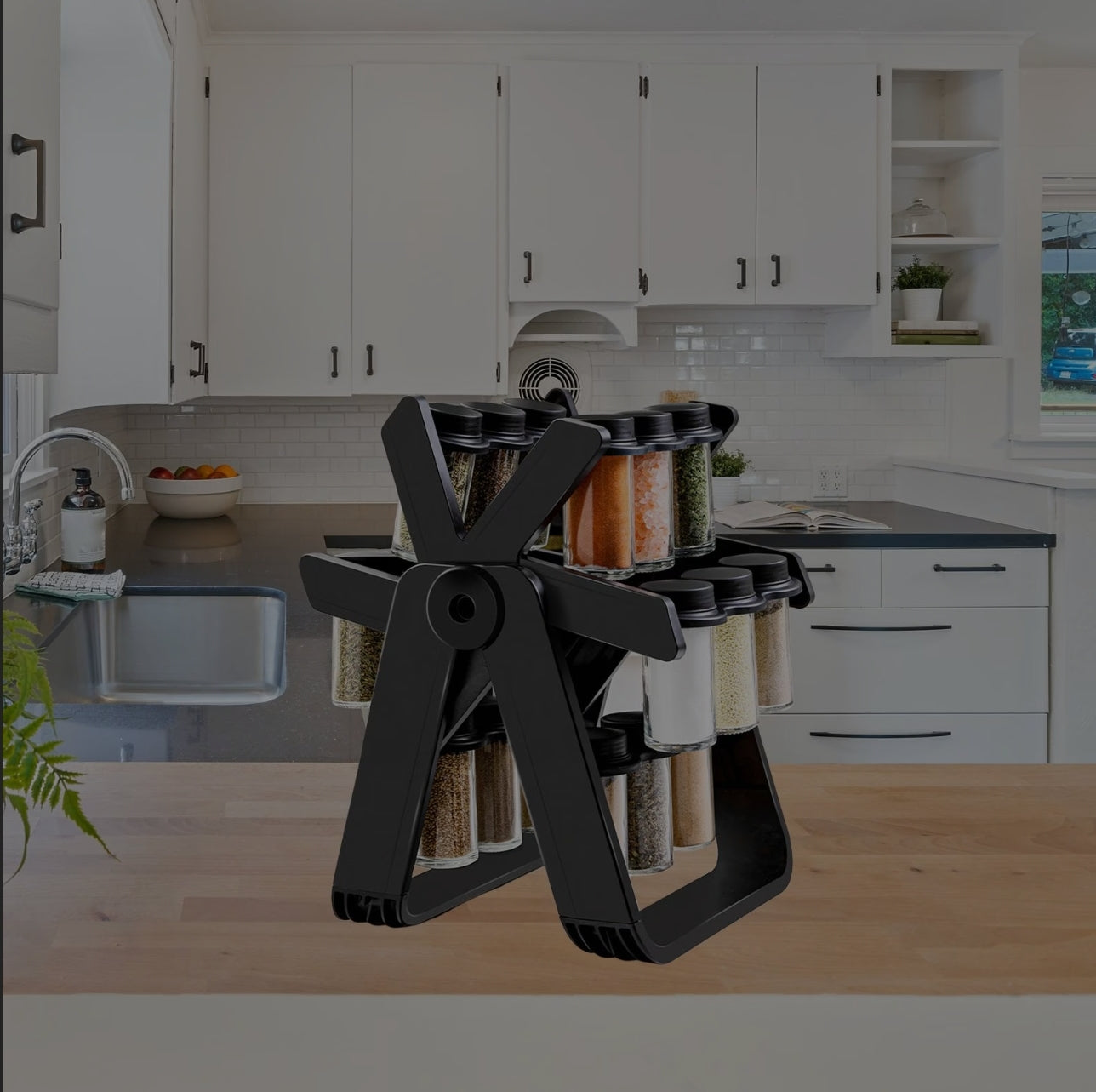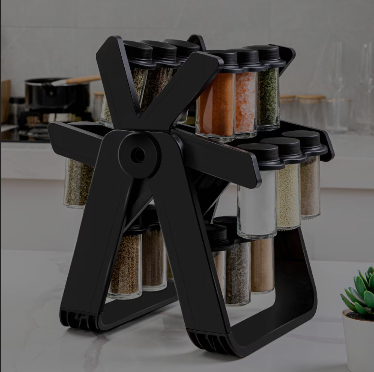 Transformă-ți bucătăria cu Organizatorul Rotativ de Condimente, care vine echipat cu 18 borcane de sticlă, ideal pentru păstrarea condimentelor tale preferate proaspete și bine organizate.