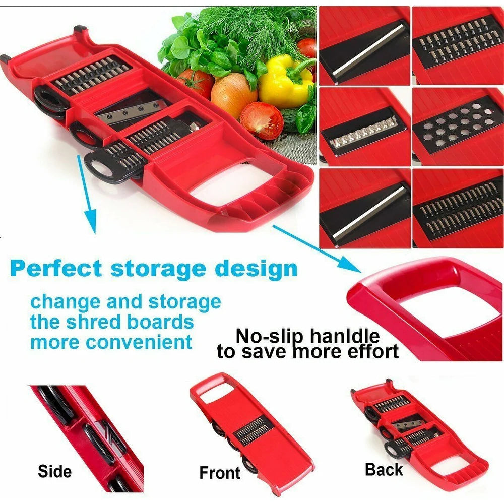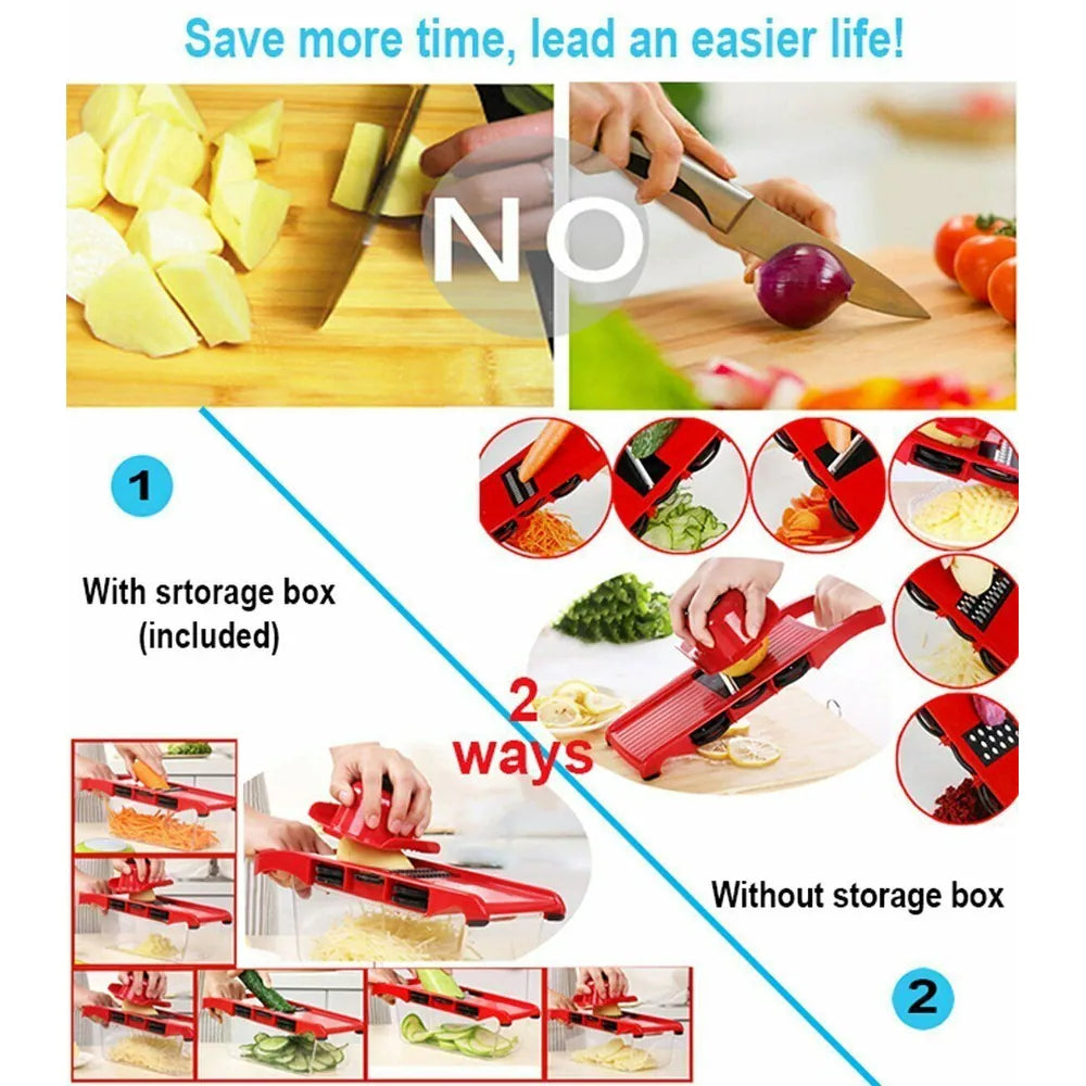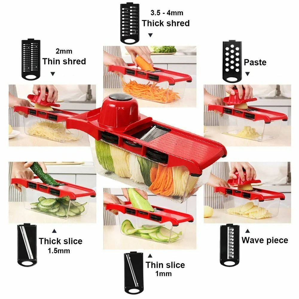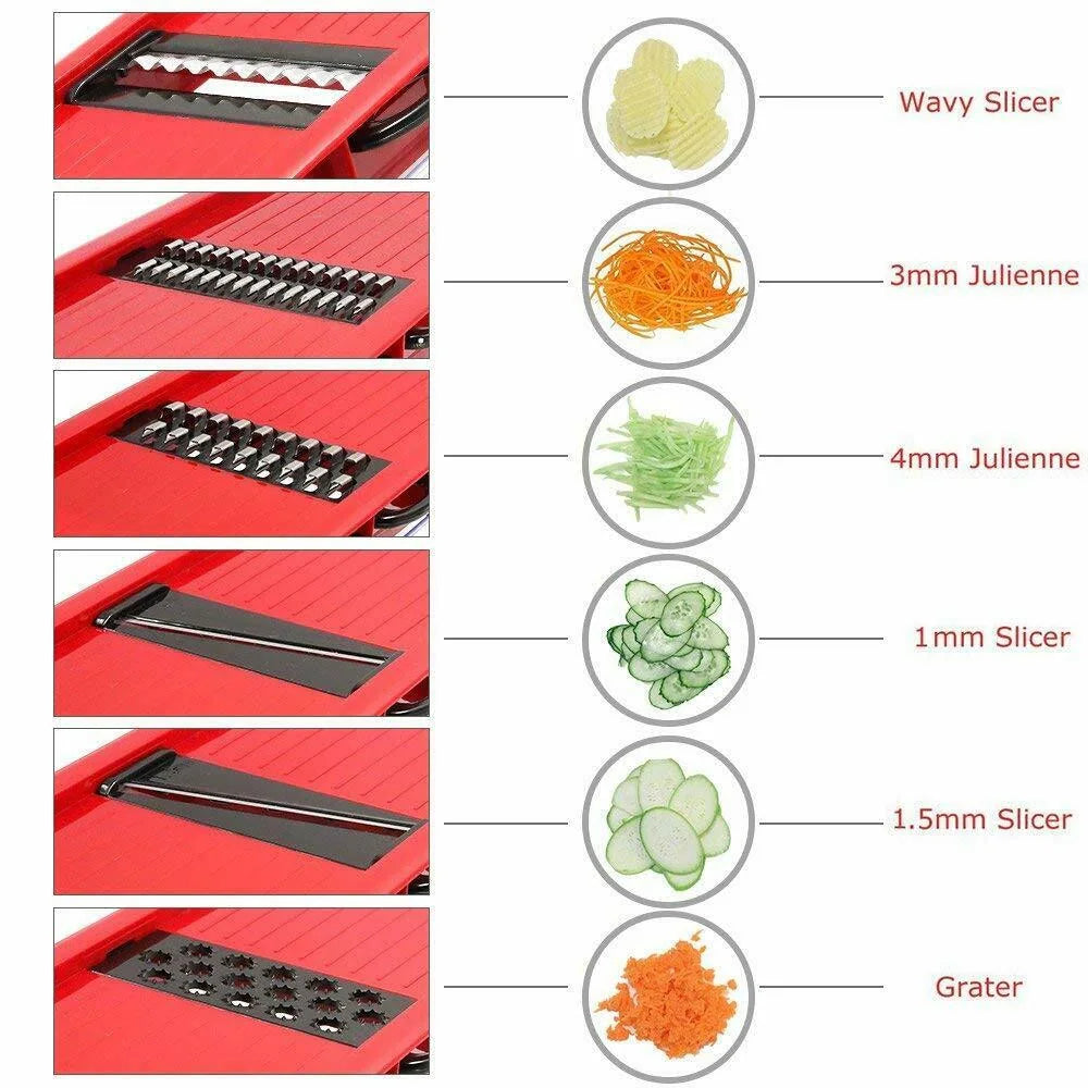 Transformați gătitul zilnic într-o activitate simplă și rapidă cu Pro Mandoline Slicer 10 în 1. Acest set complet este echipat cu tot ce aveți nevoie pentru a tăia, felia și toca legume și fructe în diferite forme și dimensiuni, economisind timp și efort în bucătărie.